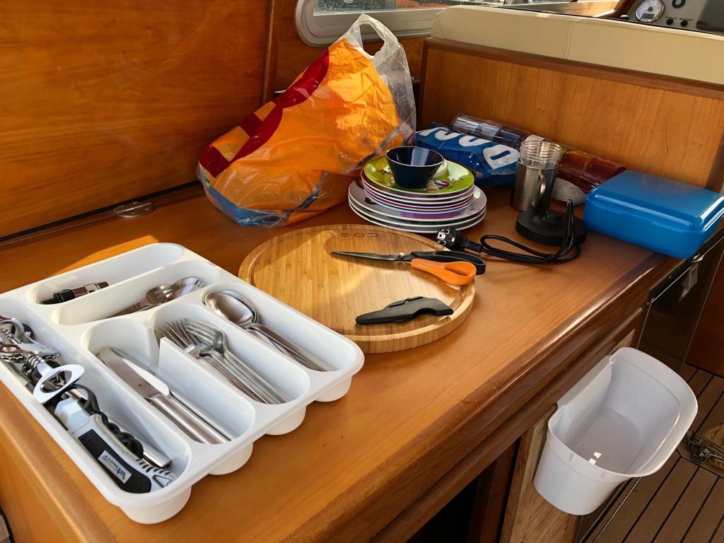 Alles ist verstaut, zumindest vorläufig. Wir haben sooooo viel Zeug, das Boot und die Staumöglichkeiten sind eigentlich super, aber wir schaffen es zu dritt alles voll zu stopfen 😝