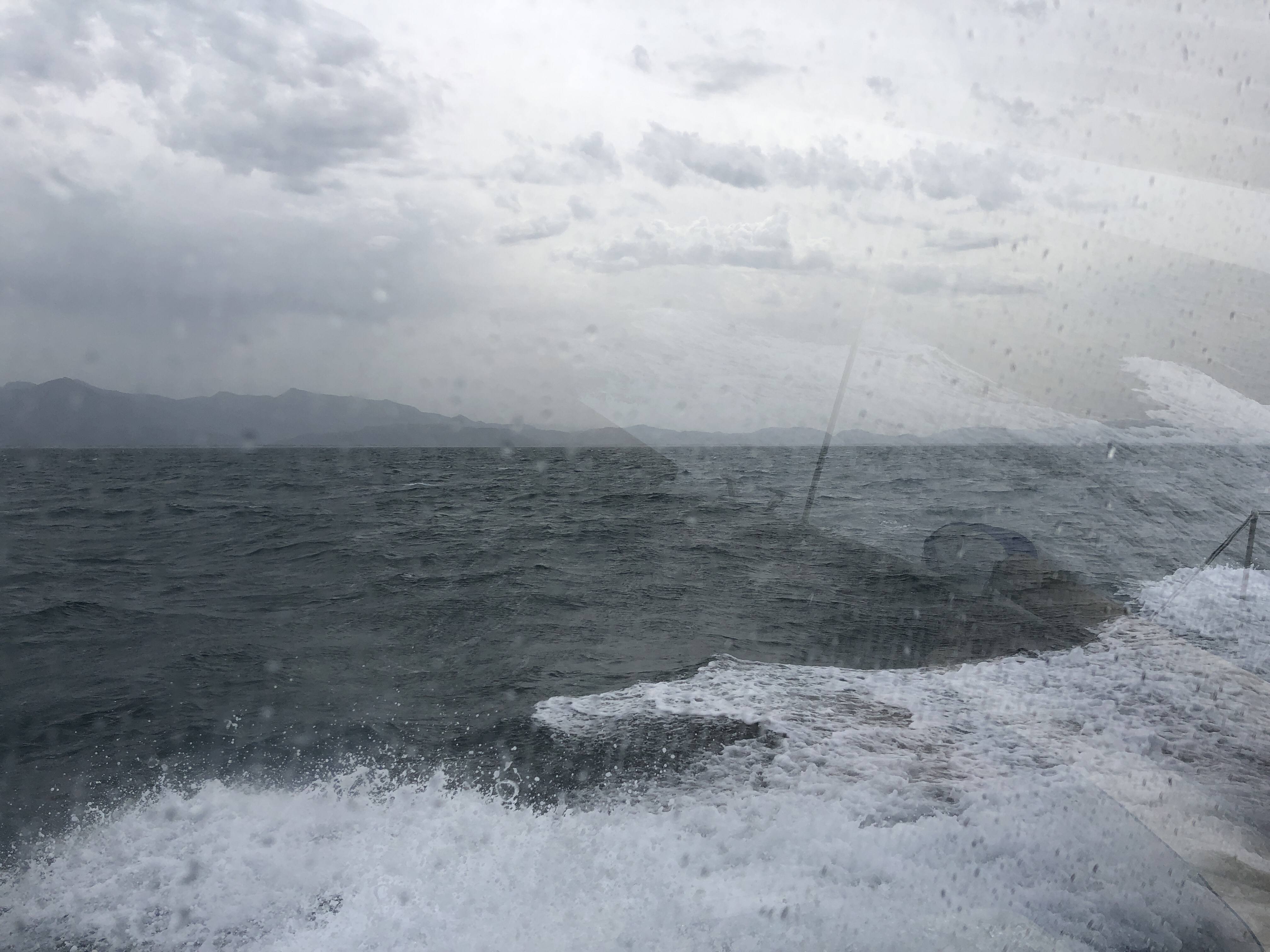 Um kurz nach 5 Uhr fragt der Käptn, regnet es? Da liege ich schon 10 min wach, weil die Wellen so laut ans Boot schlagen, dass ich davon aufgewacht bin und mir schon die selbe Frage gestellt habe. Also, hopphopp nach oben und nachschauen, was los ist. Alles ist grau, der Wind ist gar nicht so stark, aber tatsächlich es regnet, schnell alle Dachluken schließen, die Handtücher abhängen und ruckizucki wieder unter die Decke. Gedanken kreisen, wie entwickelt sich das Wetter wohl … darüber schlafen wir wieder ein.