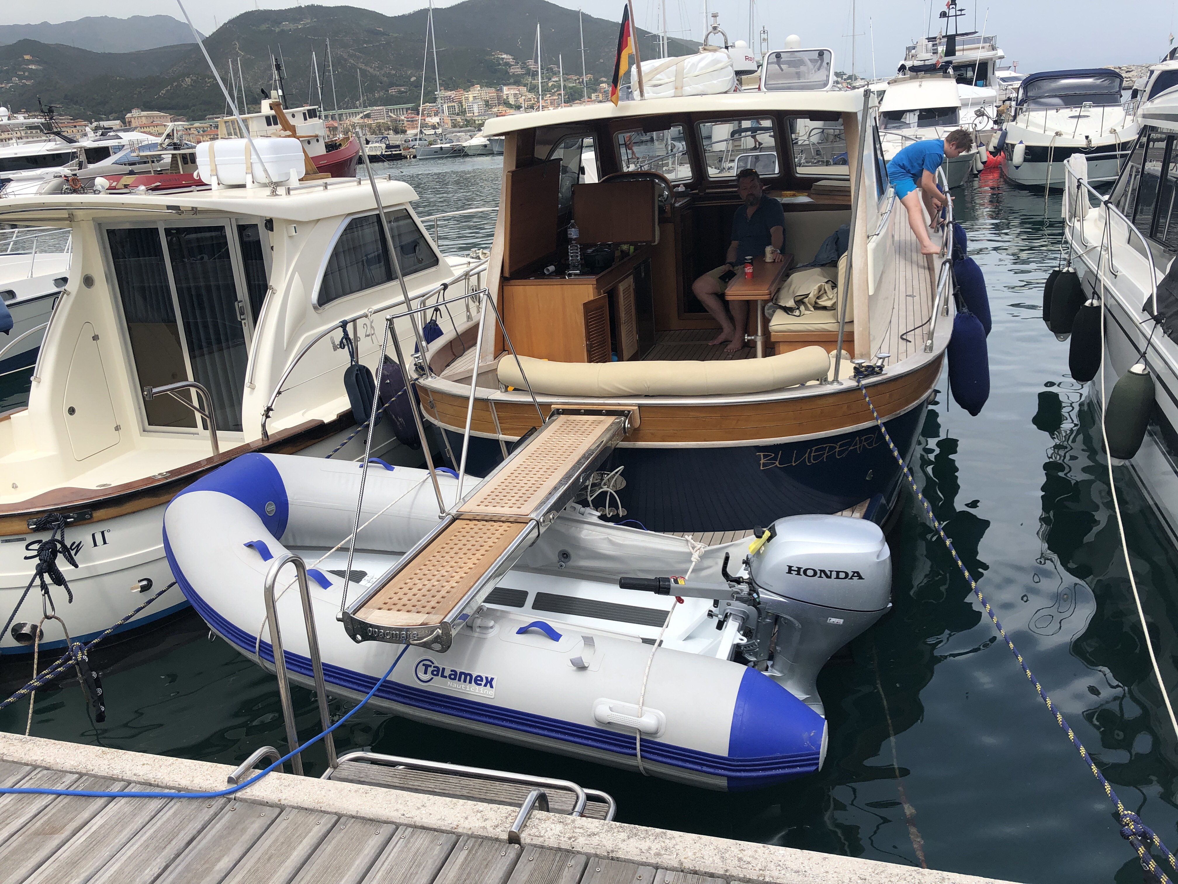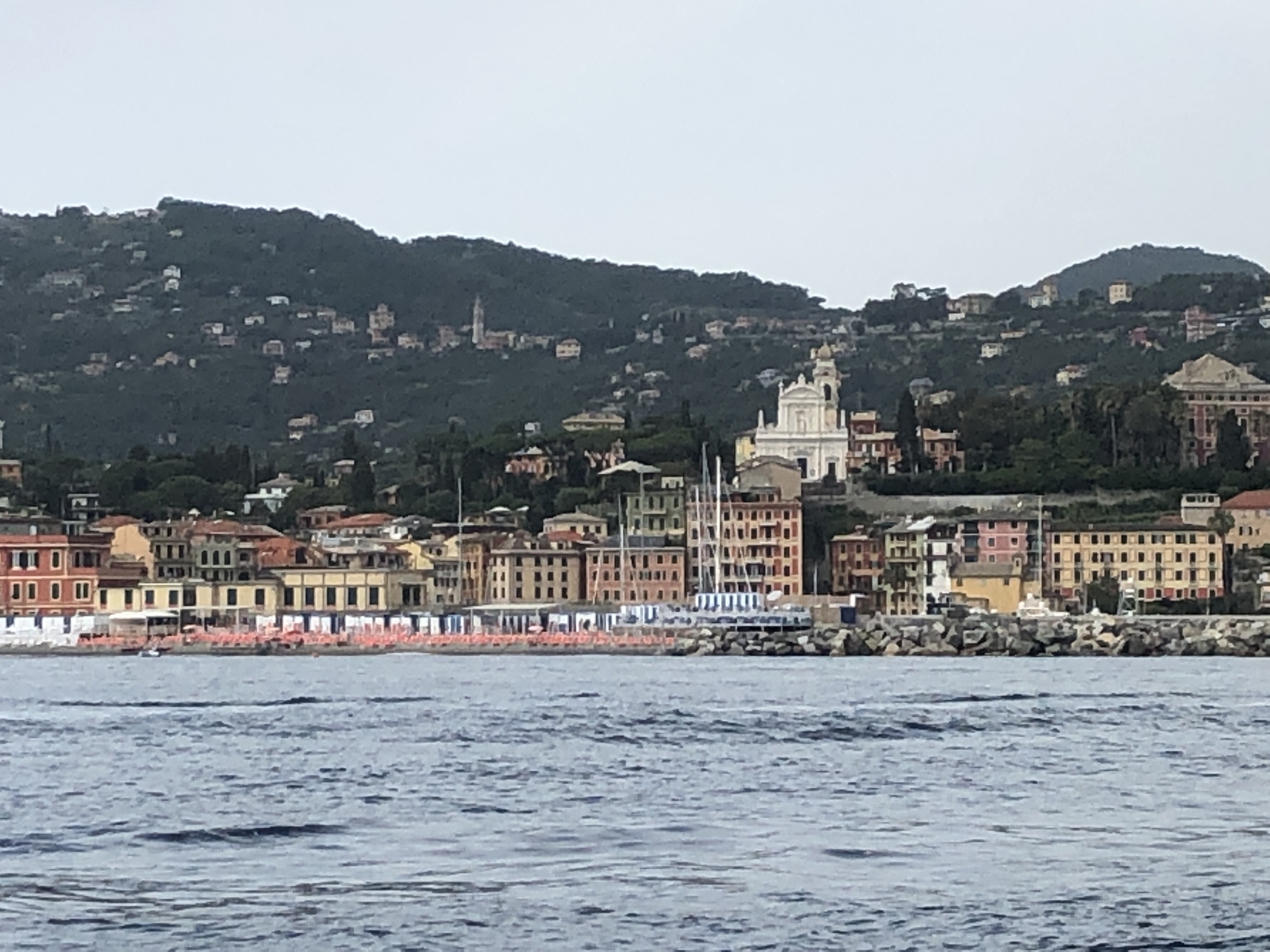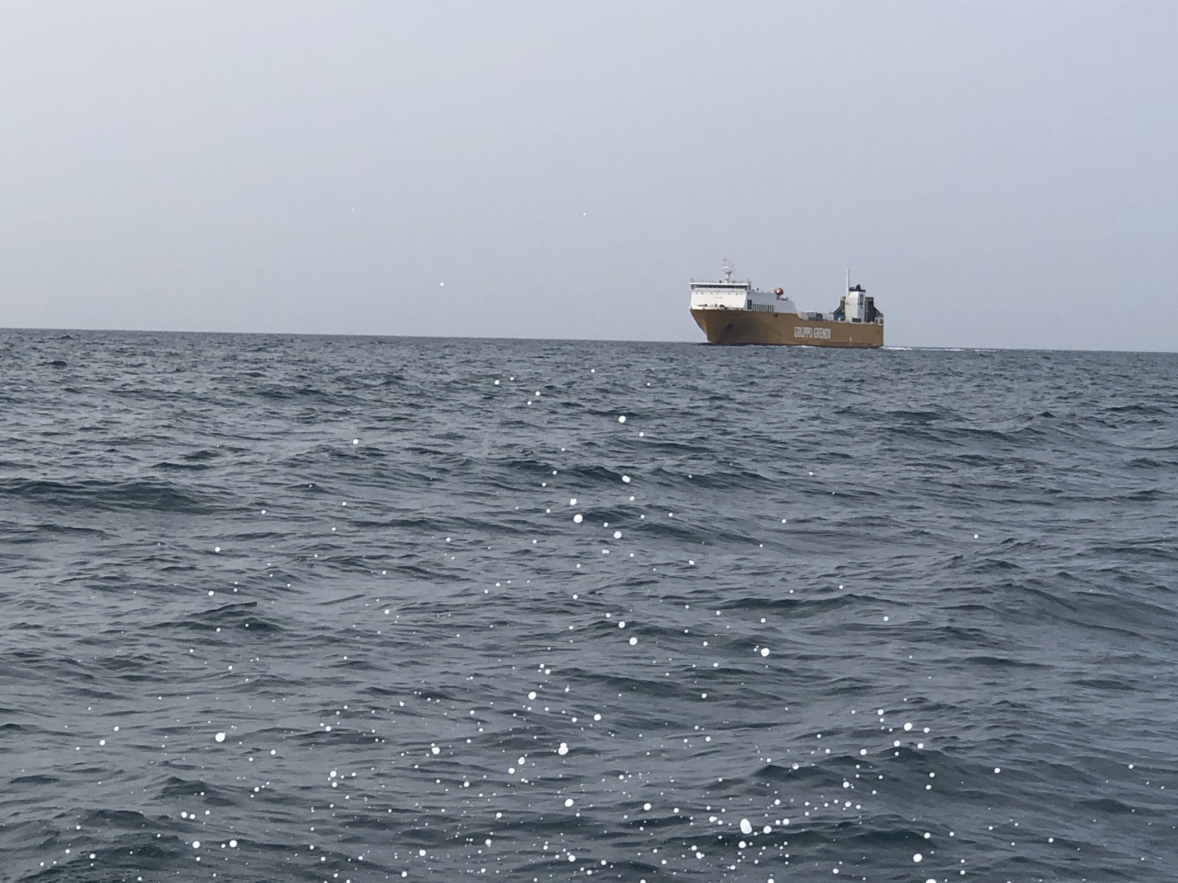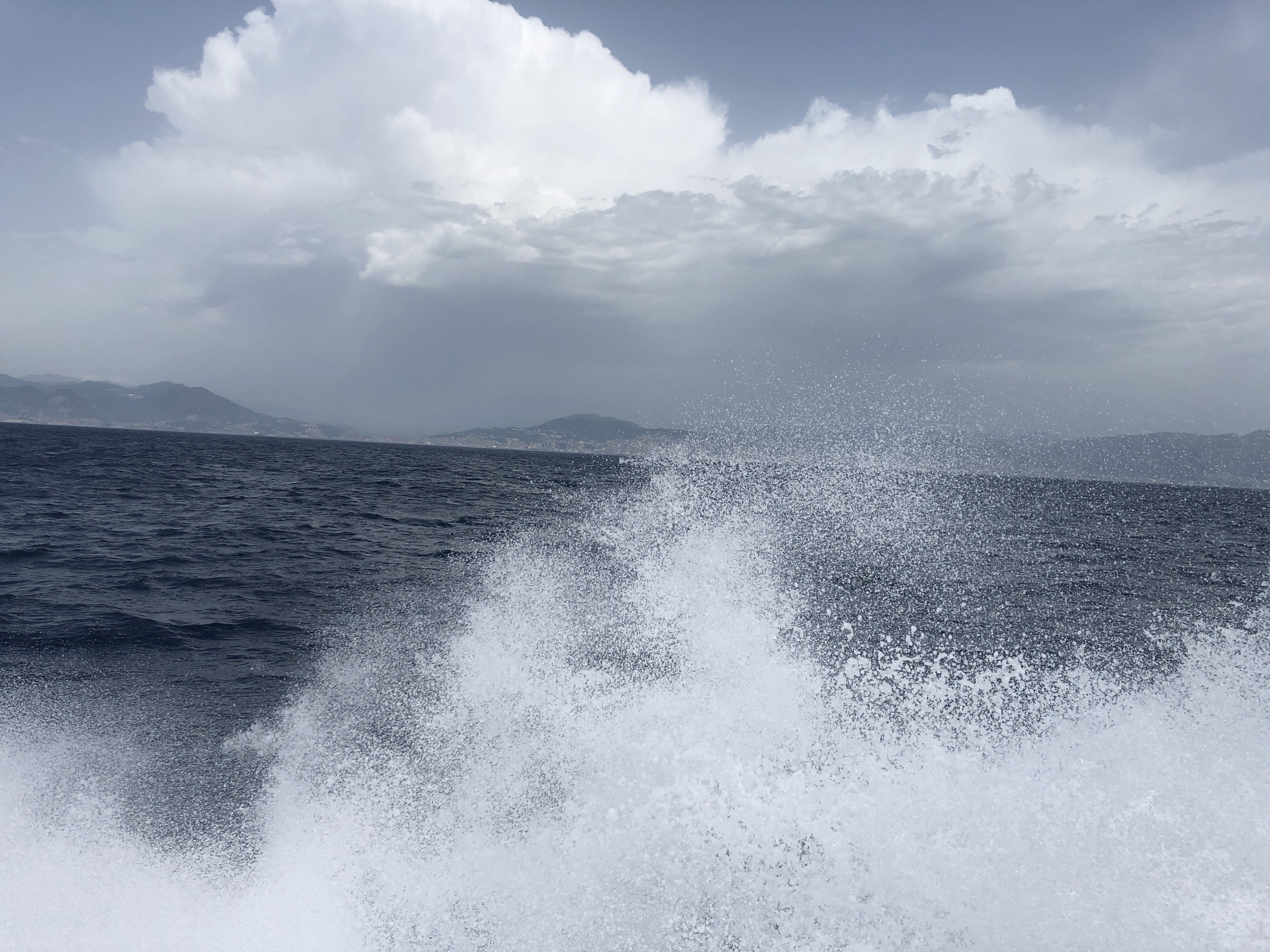 Nach 1,5 Std. auf der Höhe von La Spezia wird es endlich etwas ruhiger und das schönste, ein Verband von 5 oder 6 Tümmlern kommt uns entgegen, leider ist unsere jeweilige Geschwindigkeit so hoch, dass uns kein Foto gelingt, aber die Freude und Rührung ist riesig 🐬