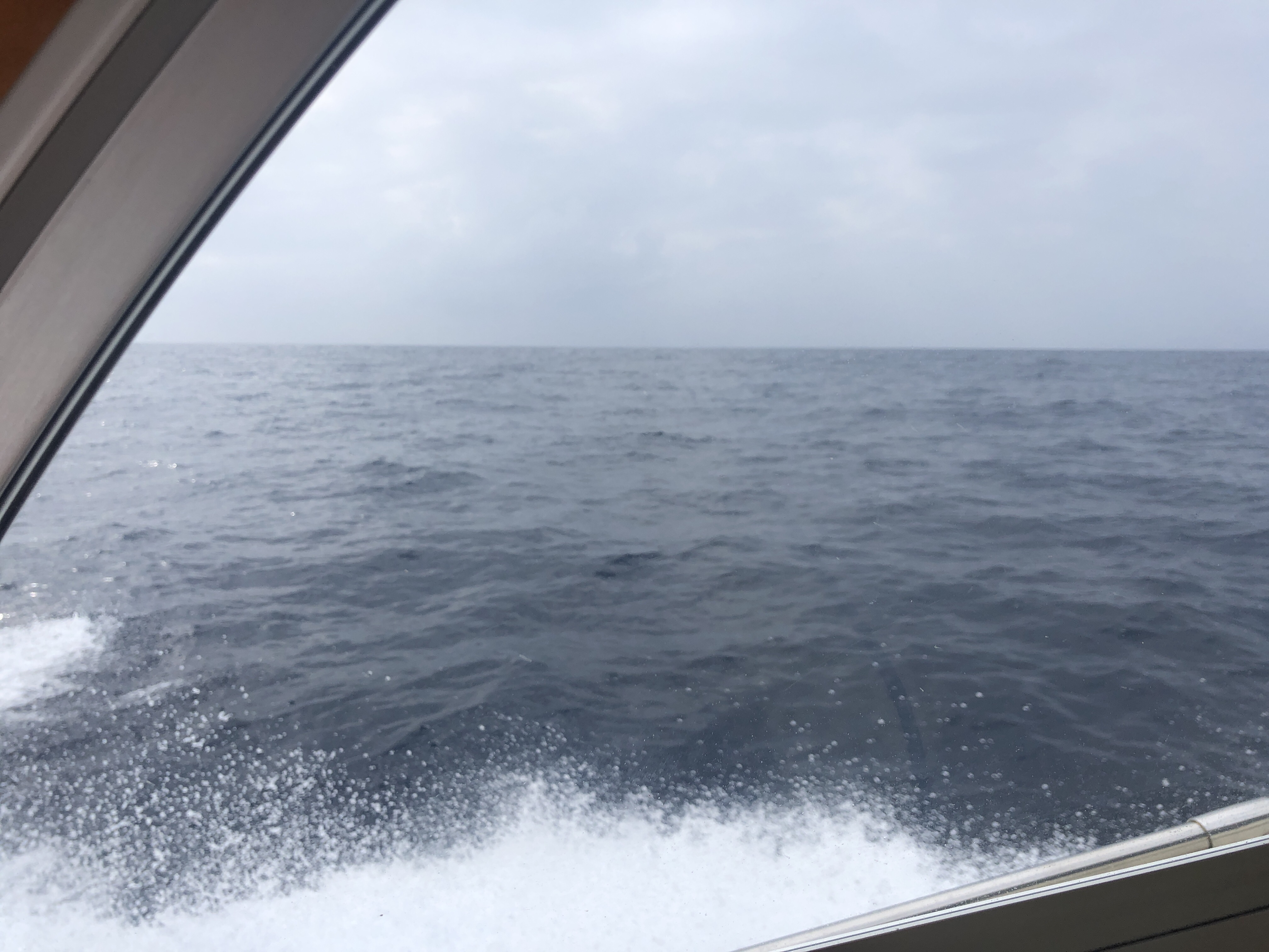 Wir bekommen richtig schwere See da draußen, Marlon ruft nach 5 Minuten freiwillig, wo sind unsere Rettungswesten und wirft alles was nicht niet und nagelfest ist ins Unterdeck, hält sich krampfhaft fest, während Cid nur sagt: Das kann doch alles nicht wahr sein!!!! Es geht zwar kein Wind, aber wir haben eine extrem starke rollende Dünung, die uns immer seitlich von vorne trifft. Auf Mallorca hatten wir schon oft 3-4 Meter Wellen, aber das hat mit diesen Kawanzmännern nichts gemeinsam.