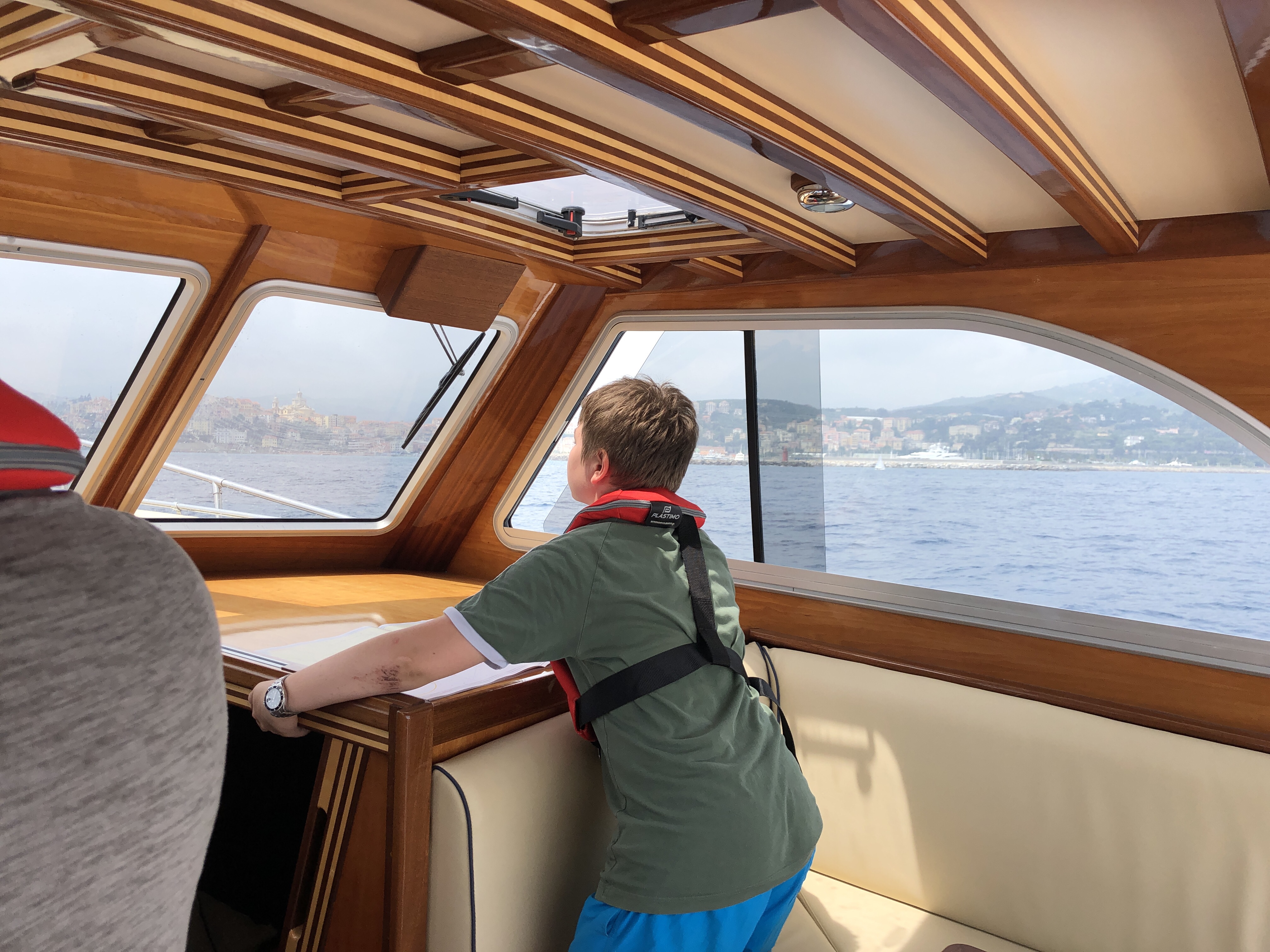 Das Meer hat sich leider nicht beruhigt, also geht der Ritt auf dem Bullen weiter und weiter – Spaß sieht anders aus! Aber, Cid hat gute Nerven und so viel Erfahrung, dass er ruhig und souverän bleibt. Sein Vertrauen in die Blue Pearl wächst mit jeder Welle, am Schluss fährt er uns bei etwas nachlassendem Wellengang noch mit 21 Knoten sicher nach Monaco. Wir sind alle heil froh das ganze nach 5 sehr anstrengenden Stunden überstanden zu haben und freuen uns einfach nur am Liegeplatz, entspannt dasitzen zu können, ohne uns festhalten zu müssen und endlich etwas zu essen, selbst mir schmeckt es schon wieder.