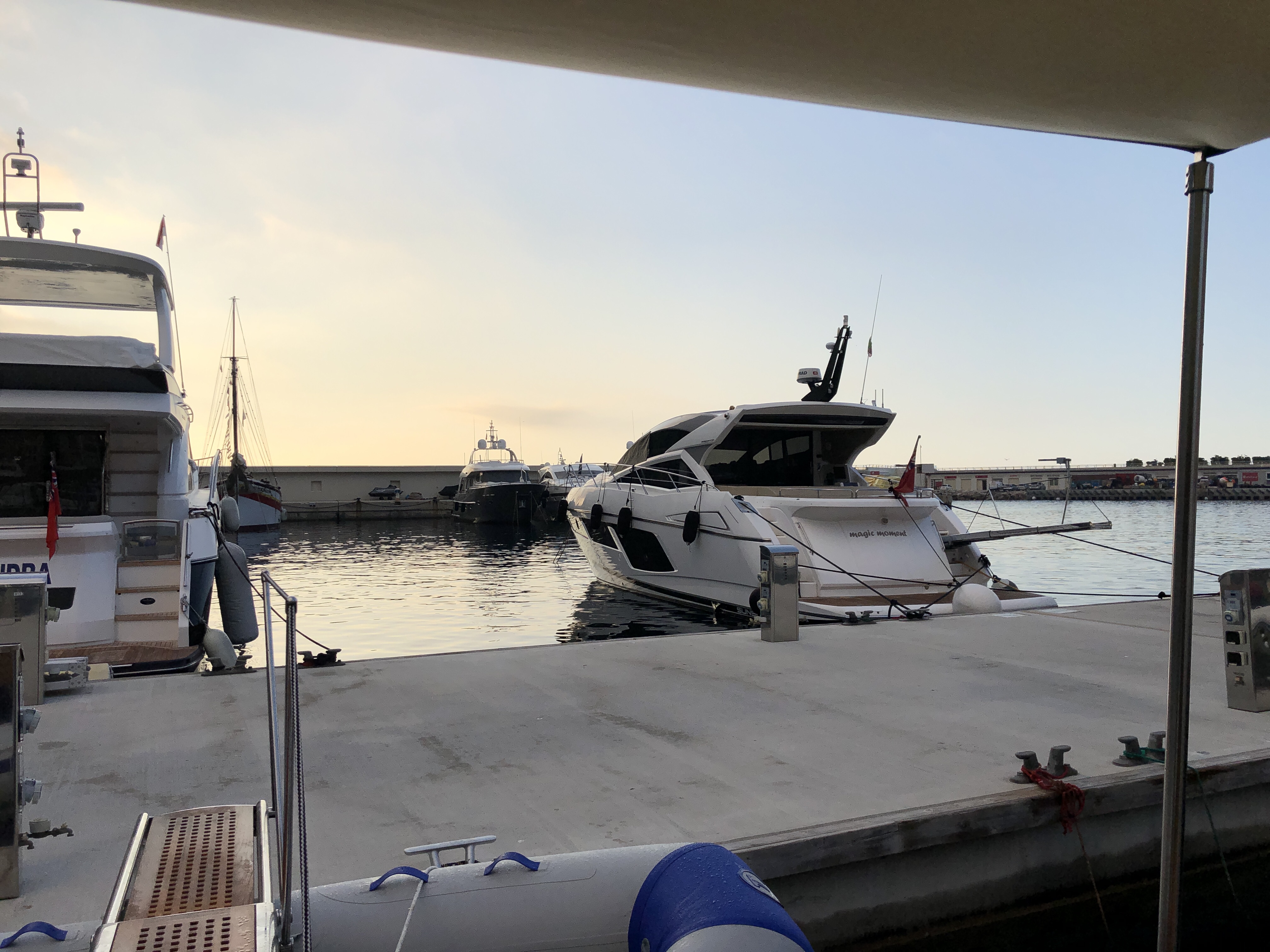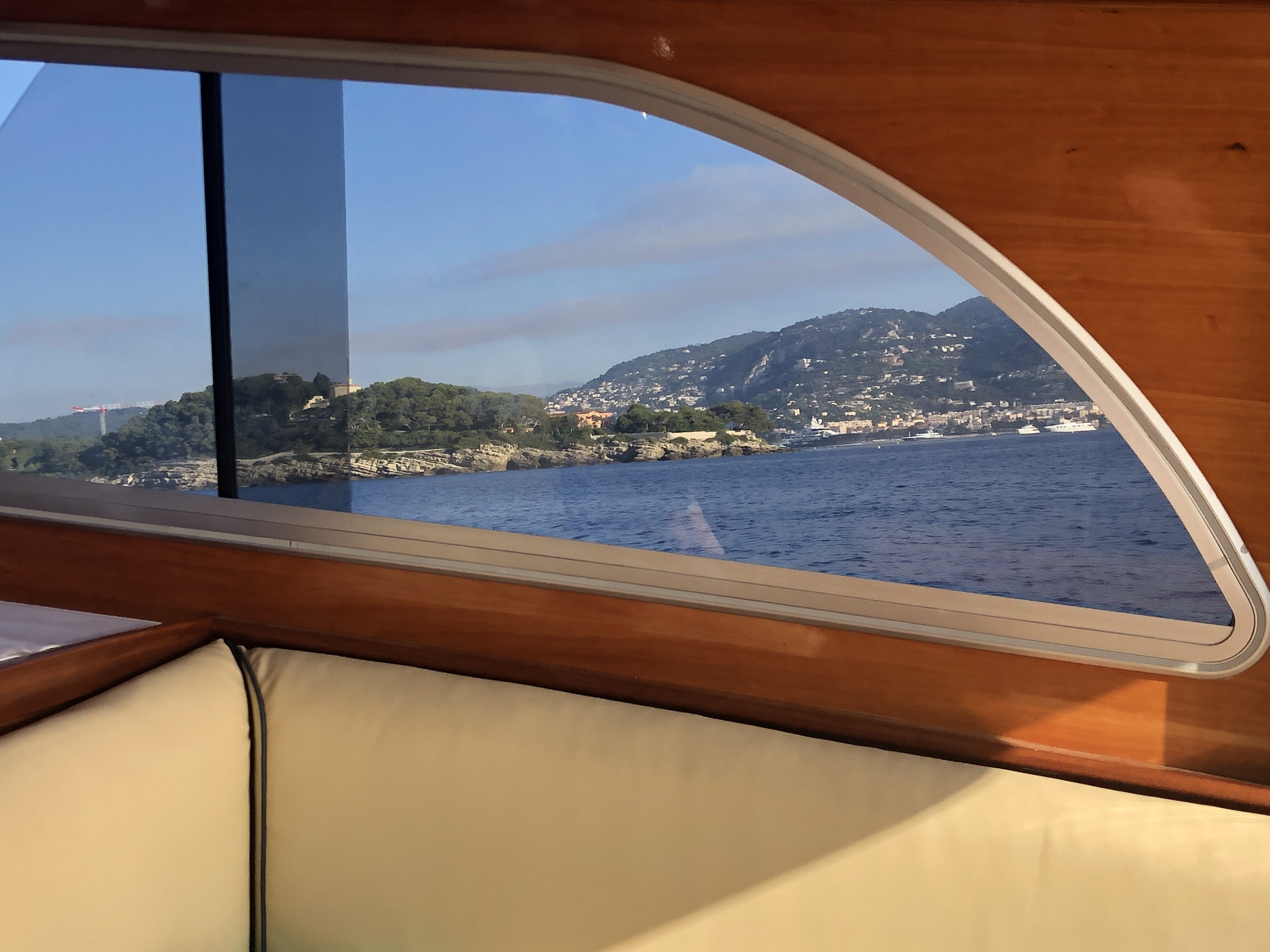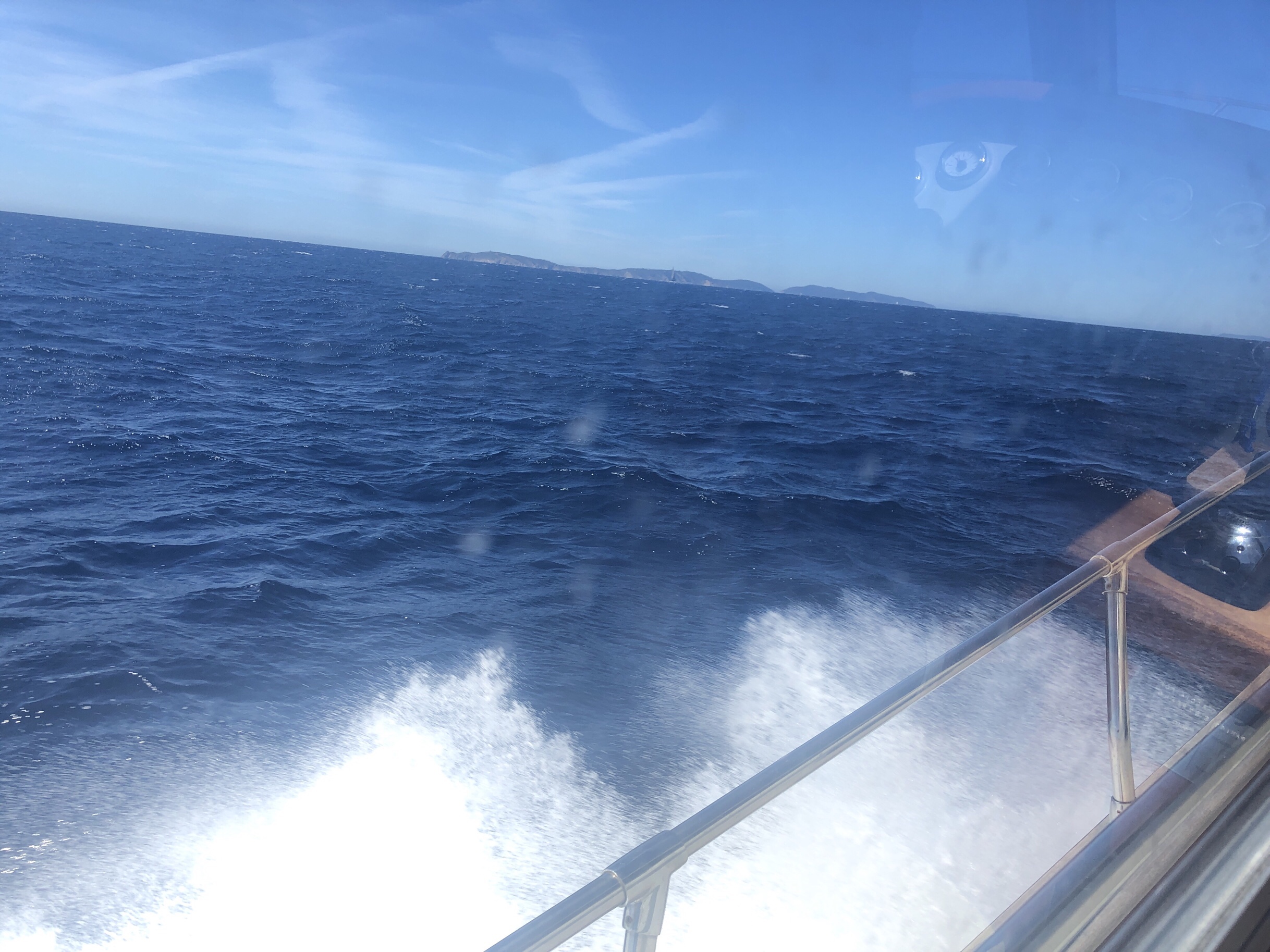 Wir haben die Wellen von allen Seiten und der Käptn sieht es ein, wir müssen Fahrt raus nehmen. Ich übernehme das Steuer und wir fahren mit Verdrängerfahrt zwischen Le Lavandou, Ile de Levantine und Ile d’Hyères mit etwas gemächlicheren 11 Knoten entlang, das zieht sich scheinbar endlos. Das Boot ist wirklich beeindruckend, wie es mit der auch heute wieder aufgewühlten See fertig wird, am Steuer ist das ganz anders wahrnehmbar. Marlon beginnt sich schon zu langweilen, aber immerhin scheint die Sonne und ein Nickerchen ist drin. Dabei knallen wir immer wieder bei größeren Wellen hart aufs Meer und der Schlaf bleibt nur von kurzer Dauer.