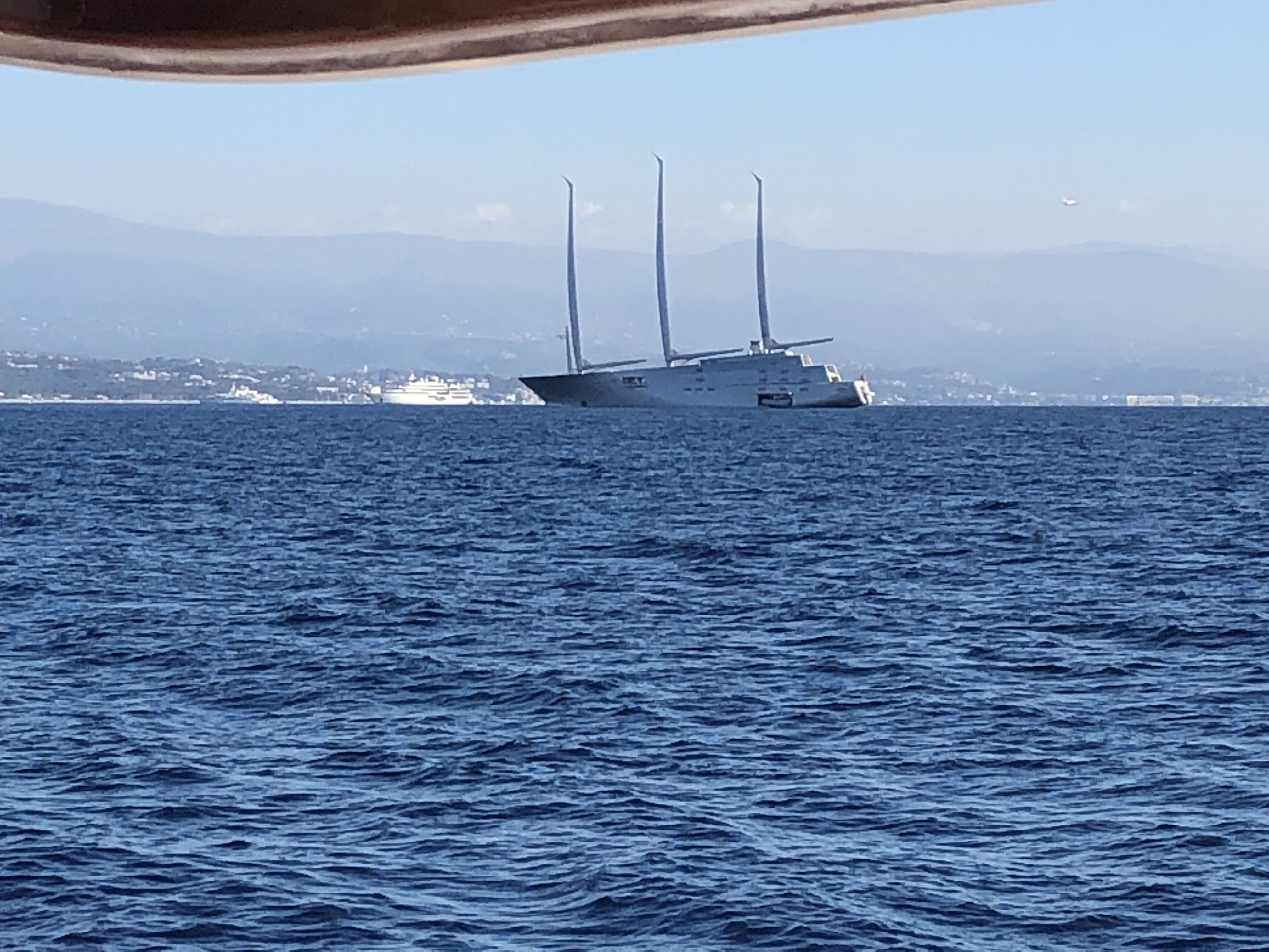 Als wir gerade Porquerolles hinter uns lassen und auf die schmale Passage zwischen Hyeres und Ile d’Hyeres zusteuern, wird das Meer noch eine Stufe wilder. Eine große Sloup fährt auf strammen Kollisionskurs und weicht keinen Deut vom Kurs ab. Gerne überlasse ich dem Käpt’n wieder das Steuer, der mal kurz auf die Tube drückt, um noch vor dem Segler vorbei zu ziehen. Das Wasser schlägt aufs und übers Boot.