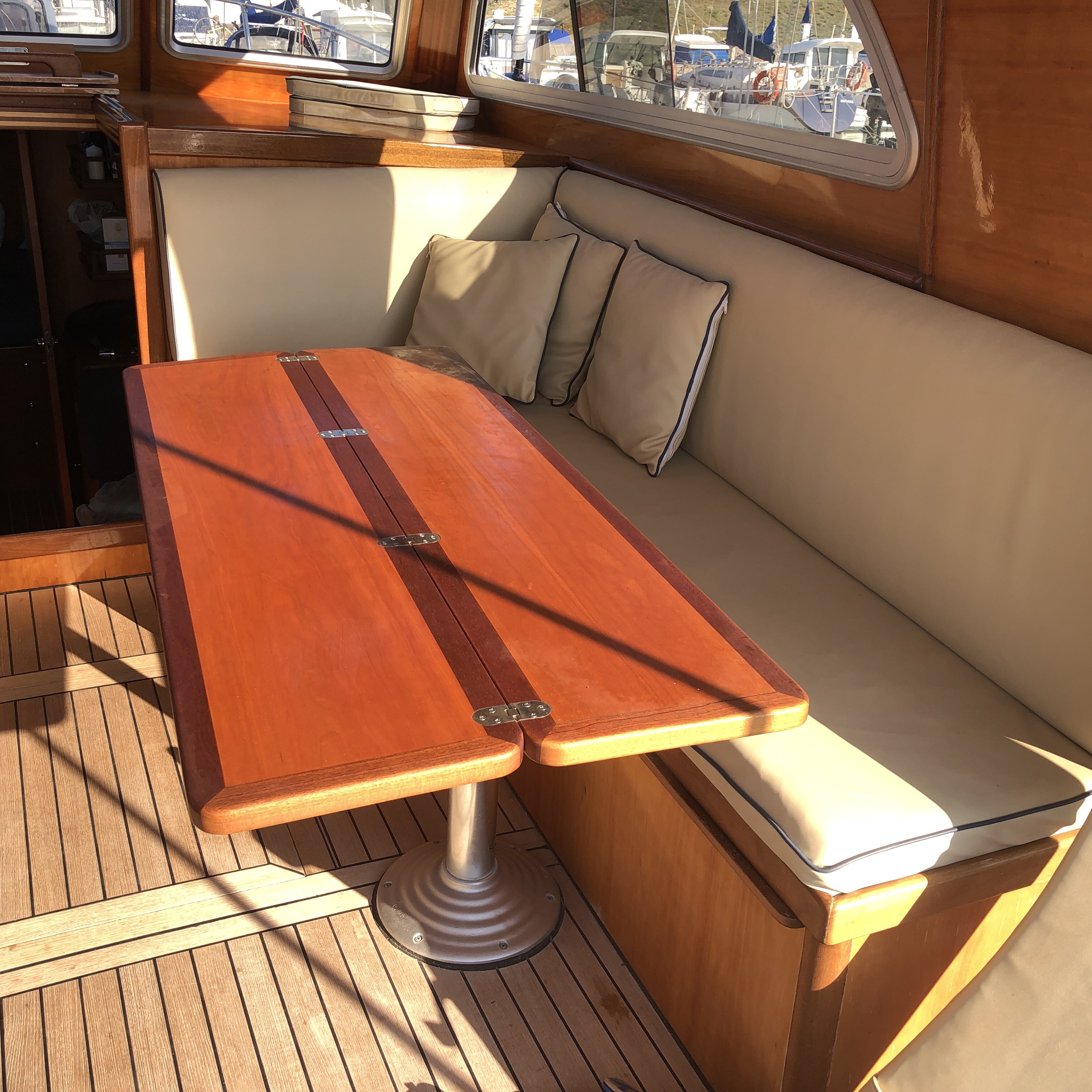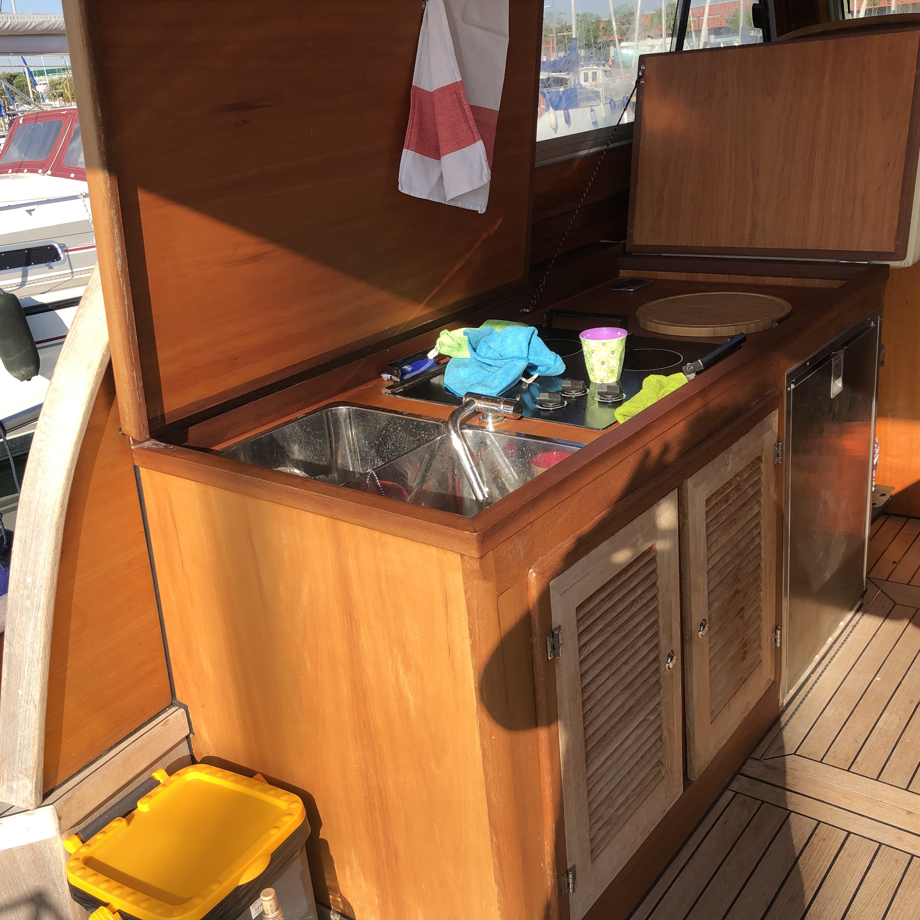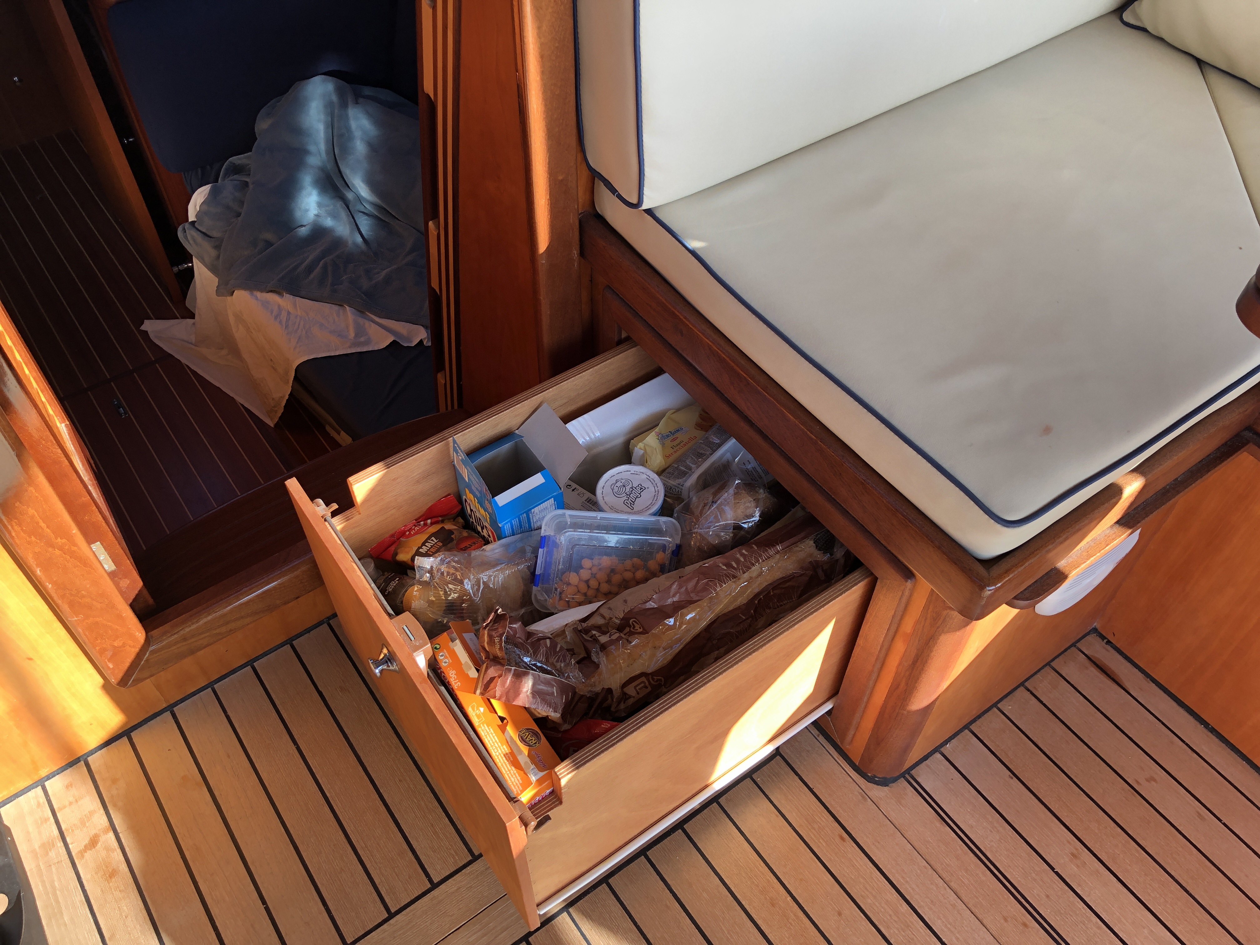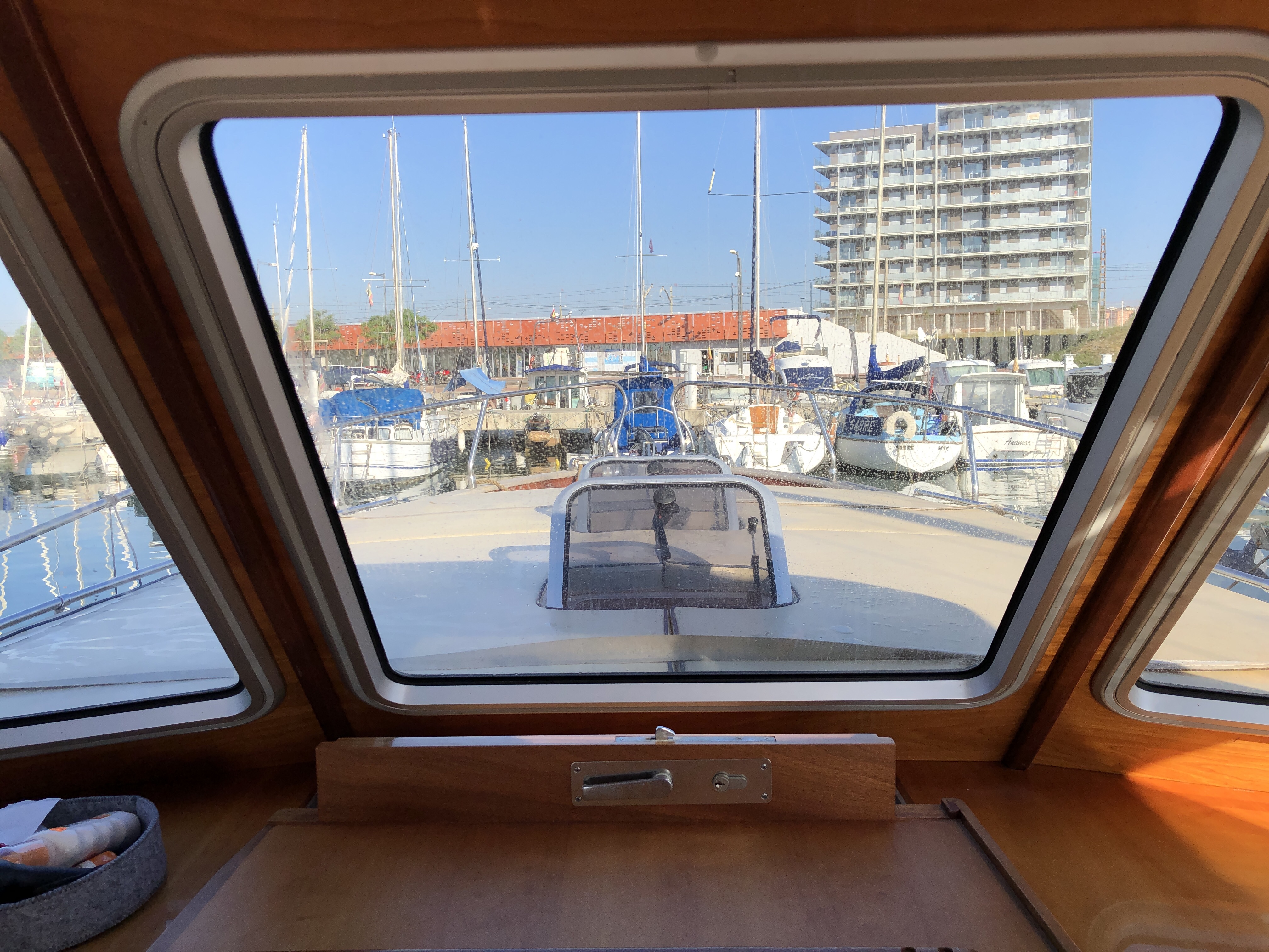 Und, jetzt ein bisschen Homestory, wie sieht’s an Bord aus? Edel verarbeitetes Holz, überall Stehhöhe, viel Stauraum, aber seht selbst …