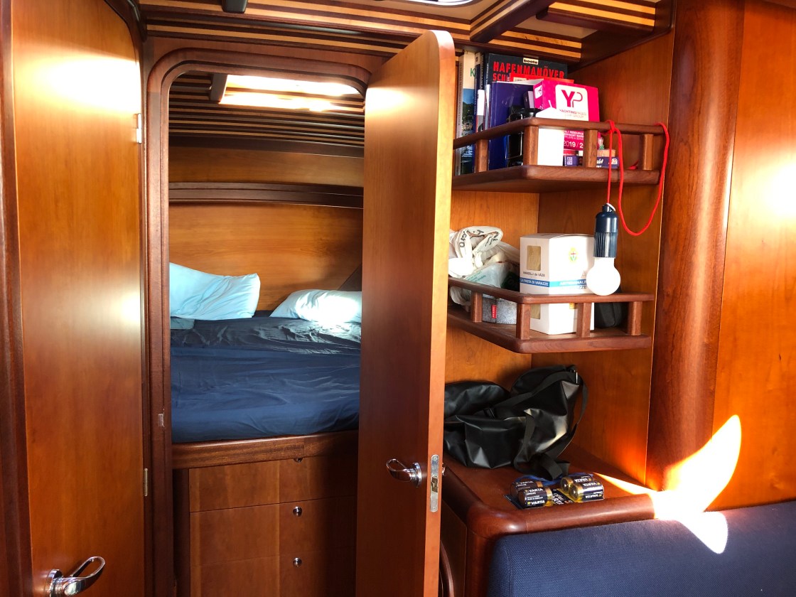 Und, jetzt ein bisschen Homestory, wie sieht’s an Bord aus? Edel verarbeitetes Holz, überall Stehhöhe, viel Stauraum, aber seht selbst …